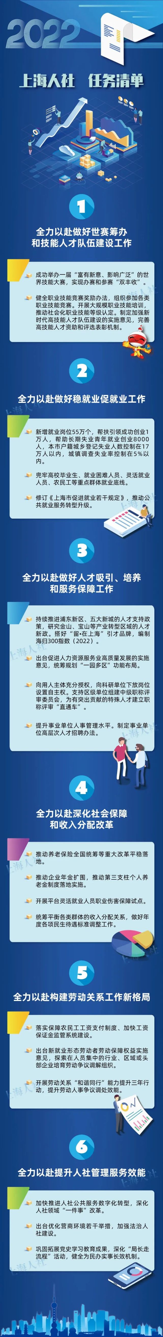 市人社局介绍,2022年,上海人力资源社会保障工作将聚焦做好世界技能大赛筹办和技能人才队伍建设工作、做好稳就业促就业工作等六方面。一图读懂