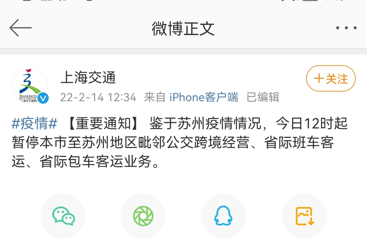 记者今天从上海市道运局获悉,鉴于苏州疫情情况,根据市交通委要求,为防止疫情通过道路客运行业传播,2月14日12时起,暂停上海市至苏州地区毗邻公交跨境经营、省际班车客运、省际包车客运业务。