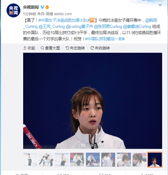 今晚的冰壶女子循环赛中,@韩雨_Curling @王芮_Curling @curling董子齐 @张丽君Curling @姜馨迪Curling 组成的中国队,历经10局比拼打成9:9平手,最终加局决战后,以11-9的成绩战胜循环赛的最后一个对手加拿大队!祝贺!#中国队拼到最后一刻#