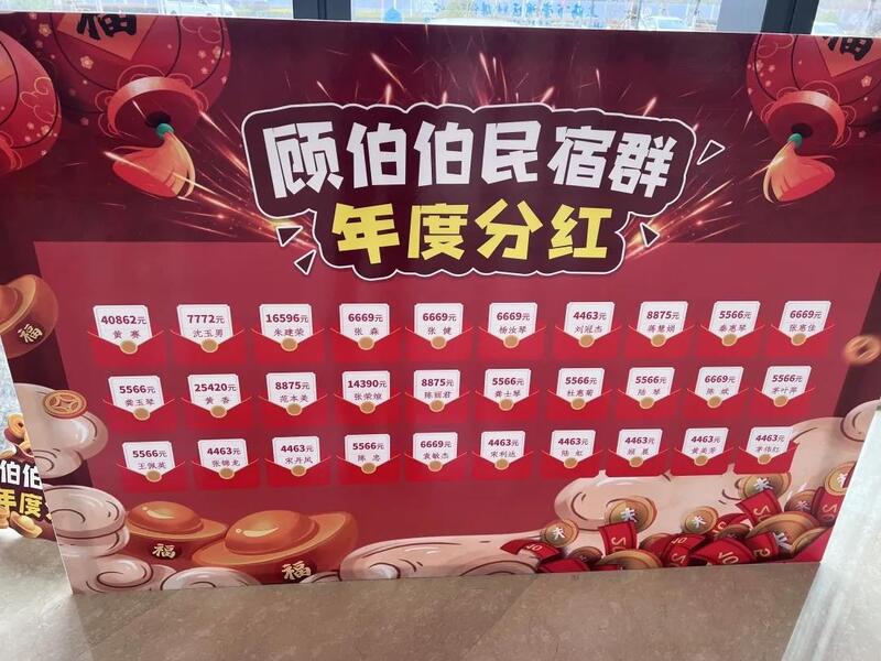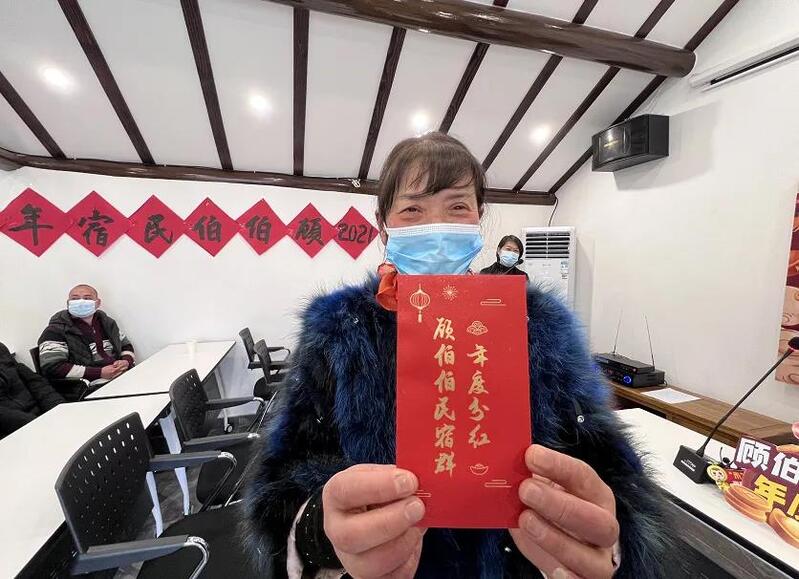“过来领红包啦!”春节前的一天,崇明区建设镇虹桥村顾伯伯民宿群会议室里一片喜庆,30位村民领到了沉甸甸的红包,最多4万多元,最少也有4000多元。他们既是民宿业主,也是顾伯伯民宿群拥有的“涛涛叫”农业专业合作社股东。2021年崇明民宿发展迅速,“涛涛叫”合作社销售额130万元,纯利润36万元,除了留出30%作来年的抗风险基金,其余均按比例给股东及业主分红。